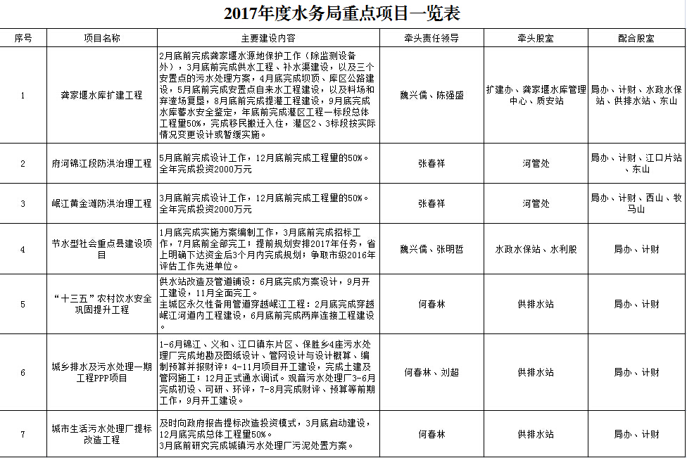 2017年度水务局重点项目一览表